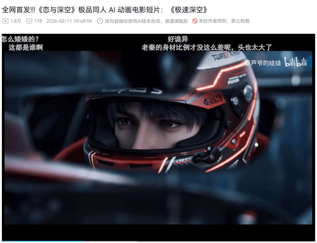 AI二创在社区的待遇各不相同,更早时候,@彩绿险磡-燹王 制作的玩家大女主向短剧,战斗戏份占比不少,却引发了乙游“女主党”相关争议。而@葫芦爷的娃娃 制作的五位男主雨夜齐聚赛车场的AI短片,被弹幕评论认定为“圈外人制作”,也没逃开玩家的“男主OOC”指控。