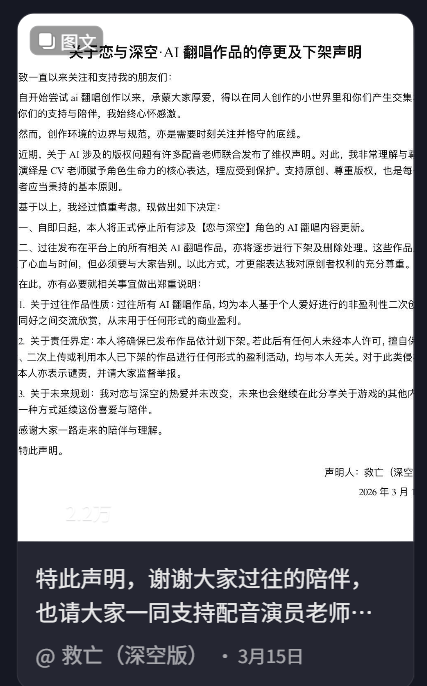 不仅如此,AI翻唱内容也在经历调整。《恋与深空》男主翻唱歌曲,在玩家群体间已经流行了许久,直到最近,配音演员们公开发声抵制AI,相关创作生态出现变化。由于《恋与深空》未公开配音演员,抵制声明的影响力相对有限,随后部分AI翻唱博主选择停更,一些玩家才意识到此类内容背后隐藏着侵权隐患。
