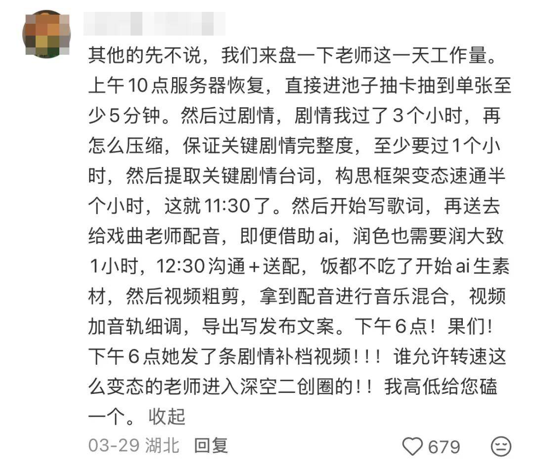 所以在官方内容公开前,“小苹果”(喜爱夏以昼的玩家)们在社区一直处于高度活跃的状态,讨论内容包括但不限于推算卡池排期、猜测新日卡卡面主题等等。众多玩家焦急等待官方消息时,这样一部完成度较高,又明显用心制作的AI二创视频,先一步满足了玩家的情感所需。
