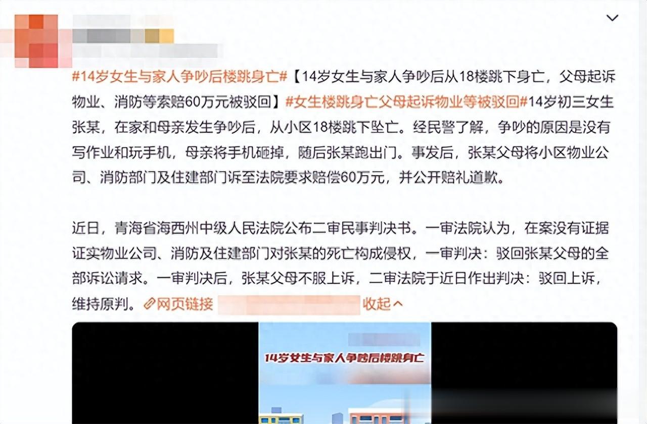 一个14岁的女孩,因为写作业和玩手机的事跟妈妈吵起来,妈妈砸了手机,孩子转头就从18楼跳了下去,最终身亡。