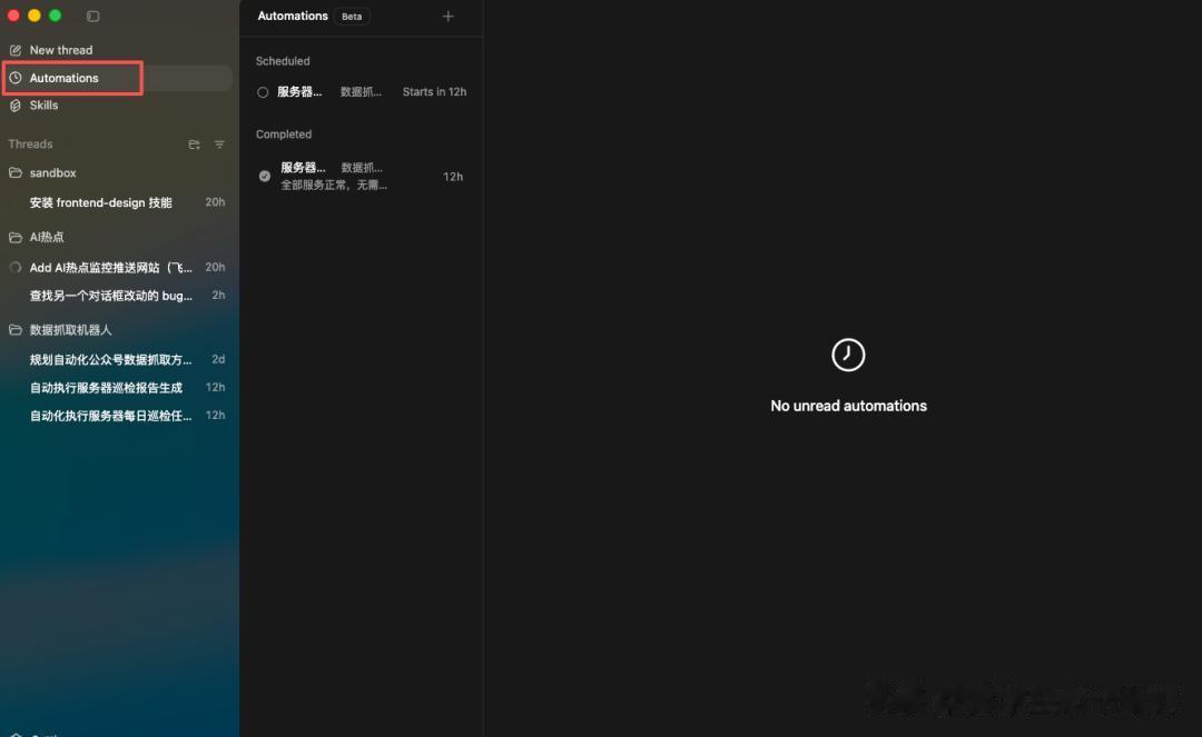 比如说我自己就有个,是因为我的好几个项目都跑在我火山引擎上的云服务器上,我对服务器其实是完全不了解的,所以我直接把我那个服务器托管给了codex,所有的东西都是它去部署去运行的,它自己就给我建了一个自动化,每天早上9点对我的服务器进行巡检,看看有没有报错。