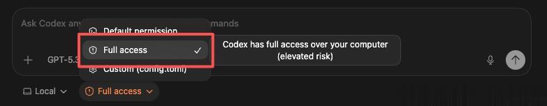 然后在对话框的首页,把权限改成Full access,让codex对你的电脑有最高的访问权限,这样就不会每次都要征求你同意了,就很烦。