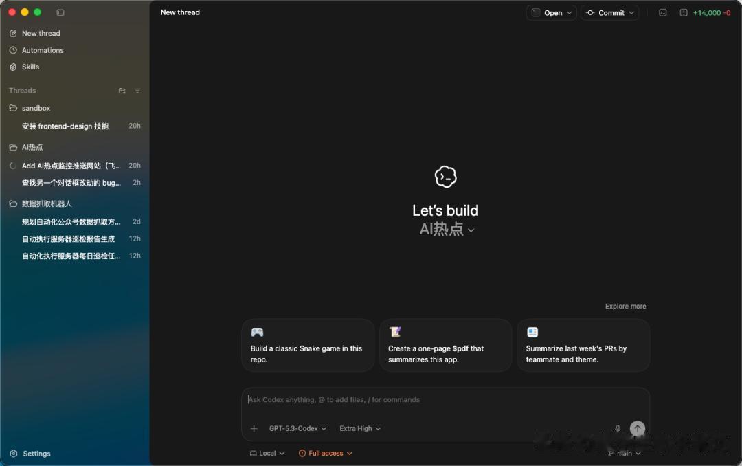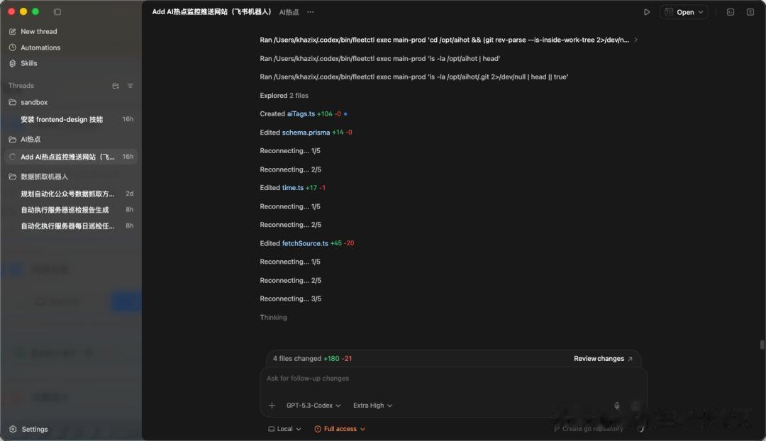 你在某个话题贴里聊需求,Codex就在同一个上下文里改文件,跑命令,做记录,你换一个话题贴,它就切换到另一条任务线。