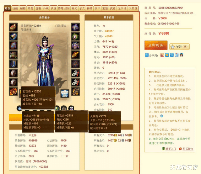 各位老铁,今天给大家介绍的是一位绝对不走寻常路的慕容选手——来自【杜康】服务器的40万评分冰火玄内四修一进阶慕容,售价仅仅8888元!