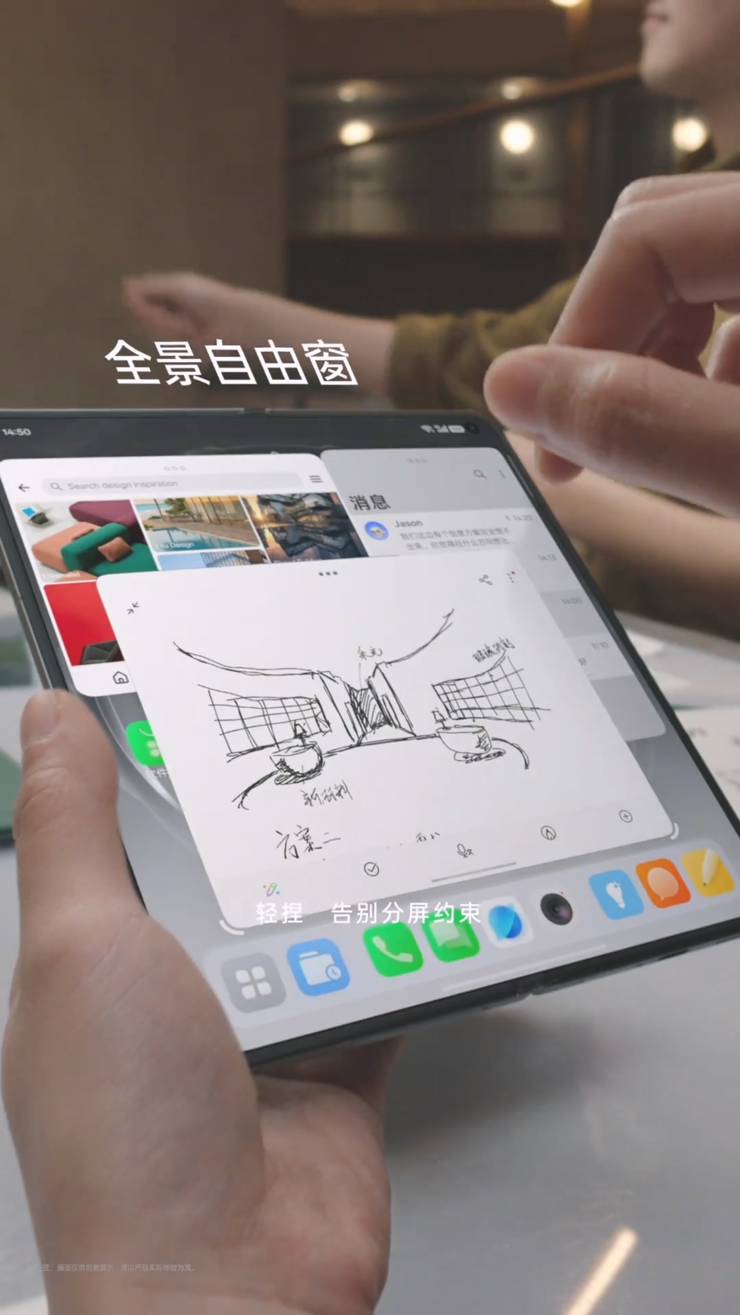 还有多任务。以前分屏用,折痕像一堵墙,把左右两边强行隔开,心理上就觉得是两个世界。现在屏幕完全平整,你在左边看邮件,右边开日历,中间还能再塞个即时通讯,四指一抓一放丝滑得像在用台式机。