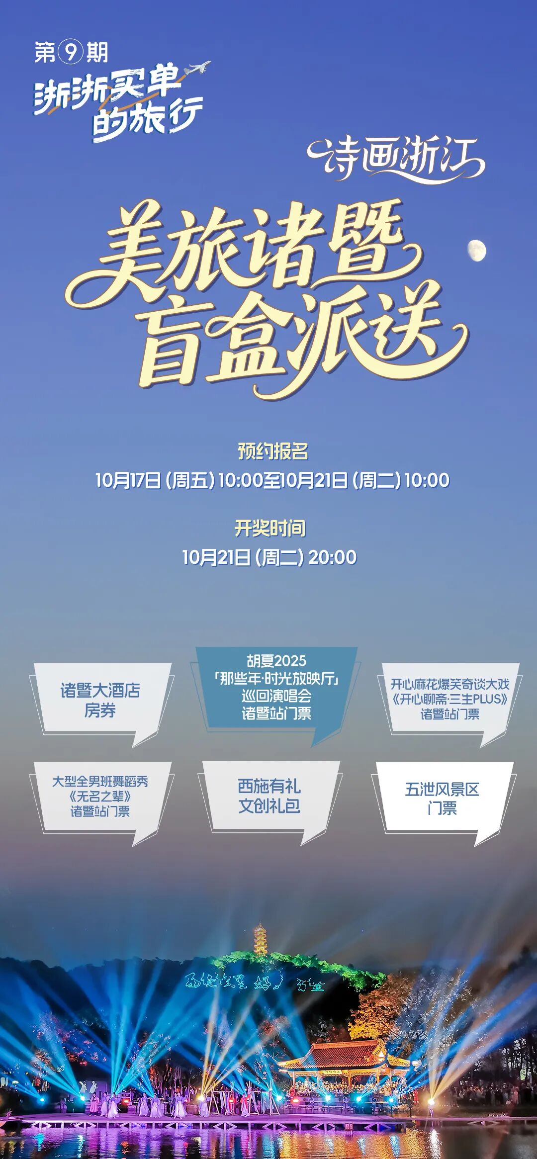 盲盒内容包含:胡夏2025「那些年·时光放映厅」巡回演唱会诸暨站门票、诸暨大酒店房券、开心麻花爆笑奇谈大戏《开心聊斋·三生PLUS》诸暨站门票、大型全男班舞蹈秀《无名之辈》诸暨站门票、西施有礼文创礼包、五泄风景区门票等。