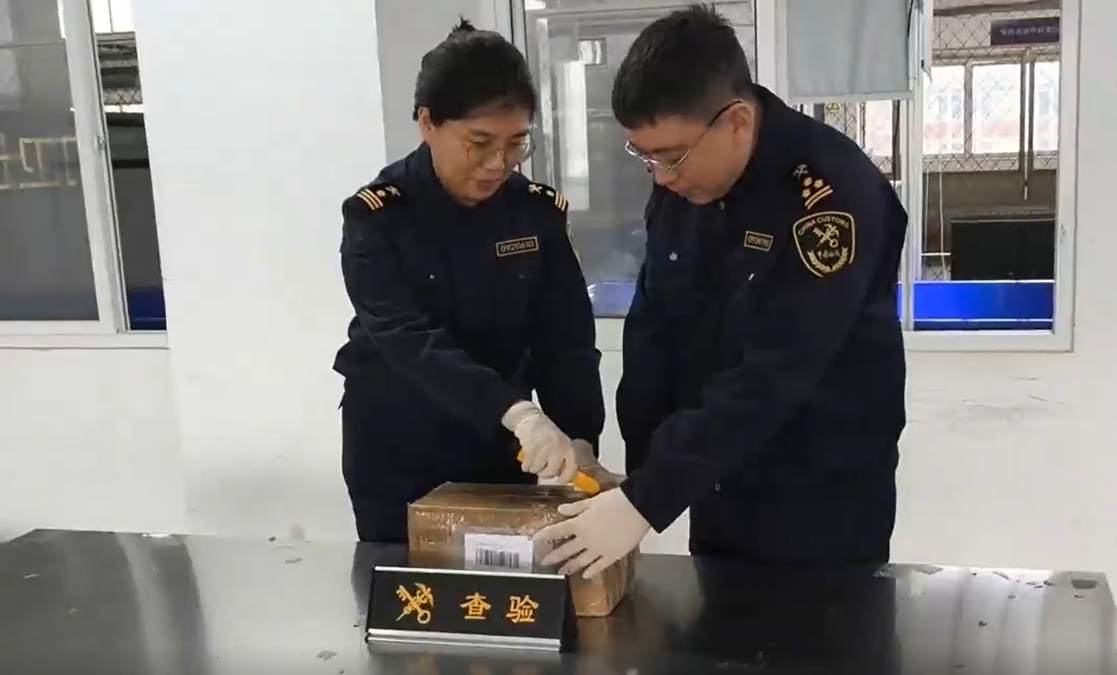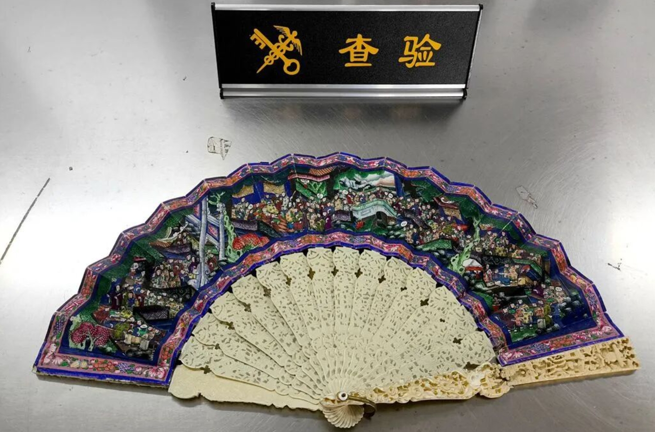 某日,海关关员在对进境邮件进行监管时,发现一个包裹机检图像存在异常。经进一步开箱查验,海关关员在该邮件内发现有折扇1把,该折扇扇骨部分色泽呈淡黄白色,质地坚硬,表面具有明显的象牙纹理结构。