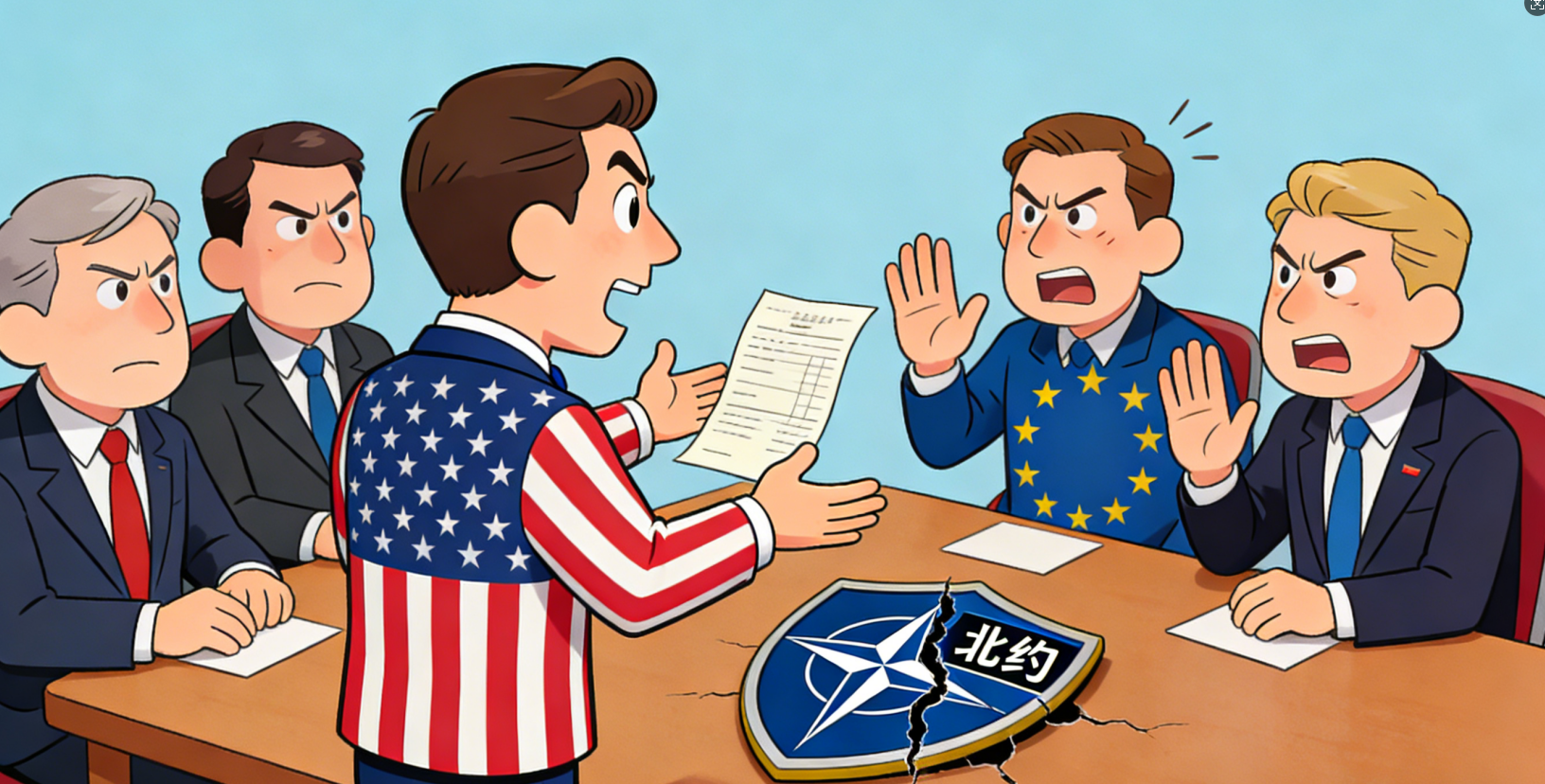 2025年,美国玩起甩锅大法,叫停对乌援助、强行加军费到5%,还不跟欧洲商量就打中东,特朗普叫嚣侵略格林兰岛,让加拿大成为美国州,欧洲等西方国家彻底寒心,偷偷组建“反薅羊毛联盟”;然后再认怂。