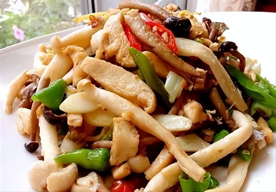 (2)鸡胸肉切丝,用淀粉抓一下,与香菇、白玉菇同炒。