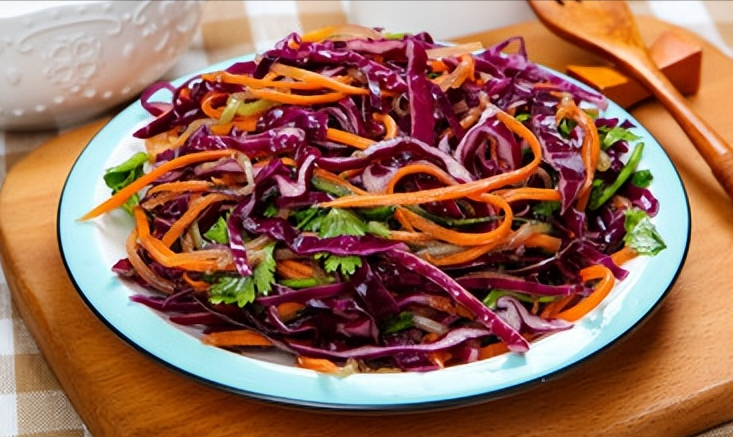 (3)紫甘蓝、胡萝卜切丝,用醋、糖、少许盐和香油凉拌。