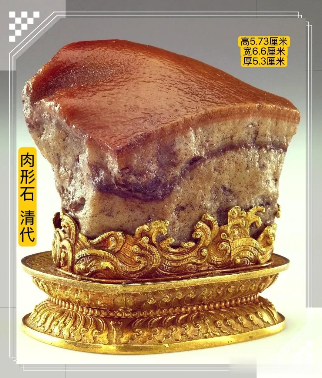 肉形石:出自内蒙古阿拉善左旗,清康熙时供入内府,是清朝宫廷珍玩。它由一块天然的黄玉,经人工巧雕,色峰纹理全是天然形成,肉皮、肥肉、瘦肉层次分明、肌理清晰,甚至肉皮上还有精细的毛孔,如同一块栩栩如生的东坡肉。其与翠玉白菜和毛公鼎并称台北故宫博物院的镇馆三宝。