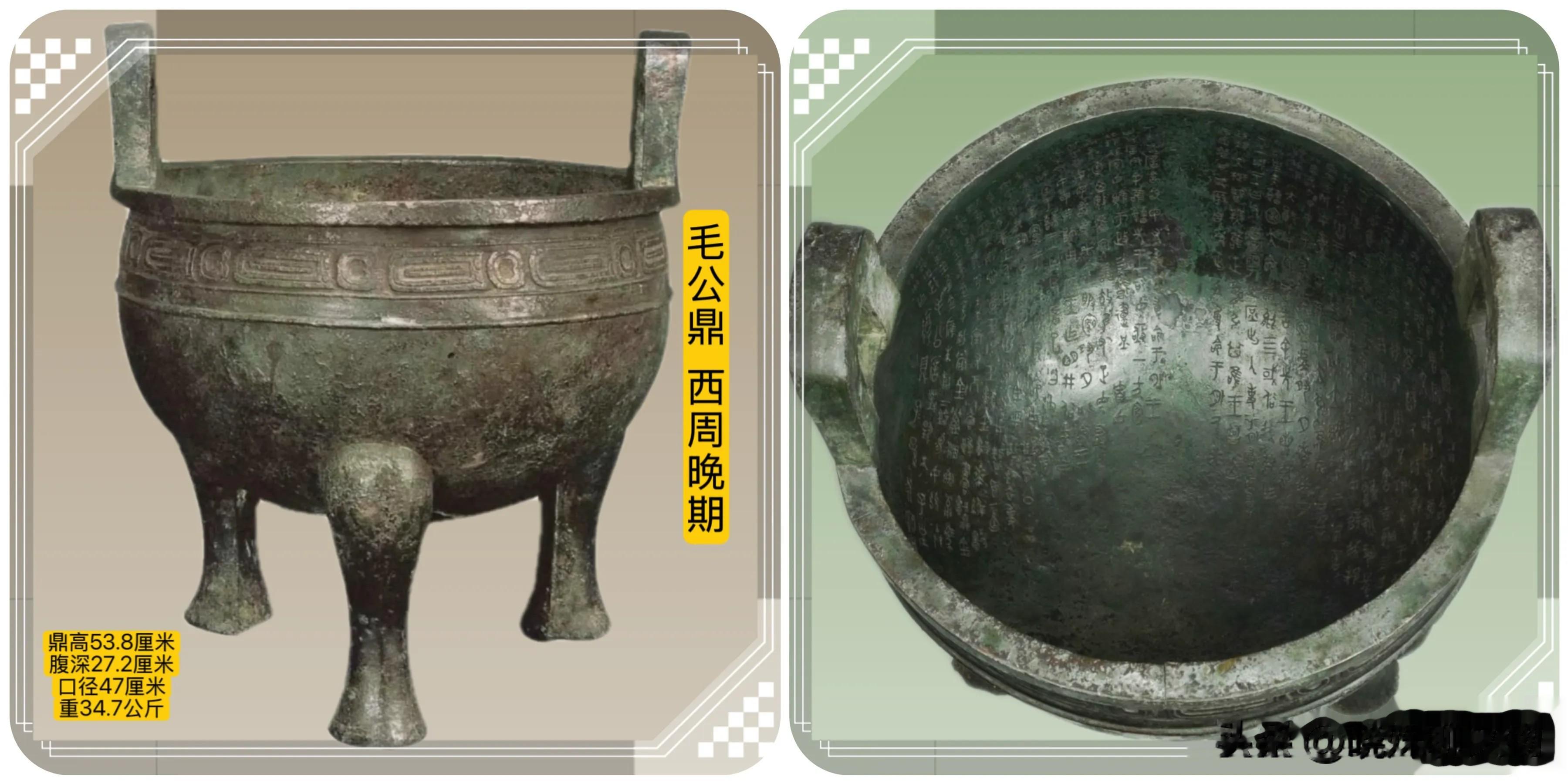 毛公鼎:西周晚期青铜器,因作器者毛公而得名。清道光二十三年出土于陕西岐山,鼎内铭文字数为499字,是现存青铜器铭文中最长的一篇,内容叙事完整,记载详实,被誉为“抵得一篇《尚书》”,是研究西周晚年政治史的重要史料,其书法也极具古典美。