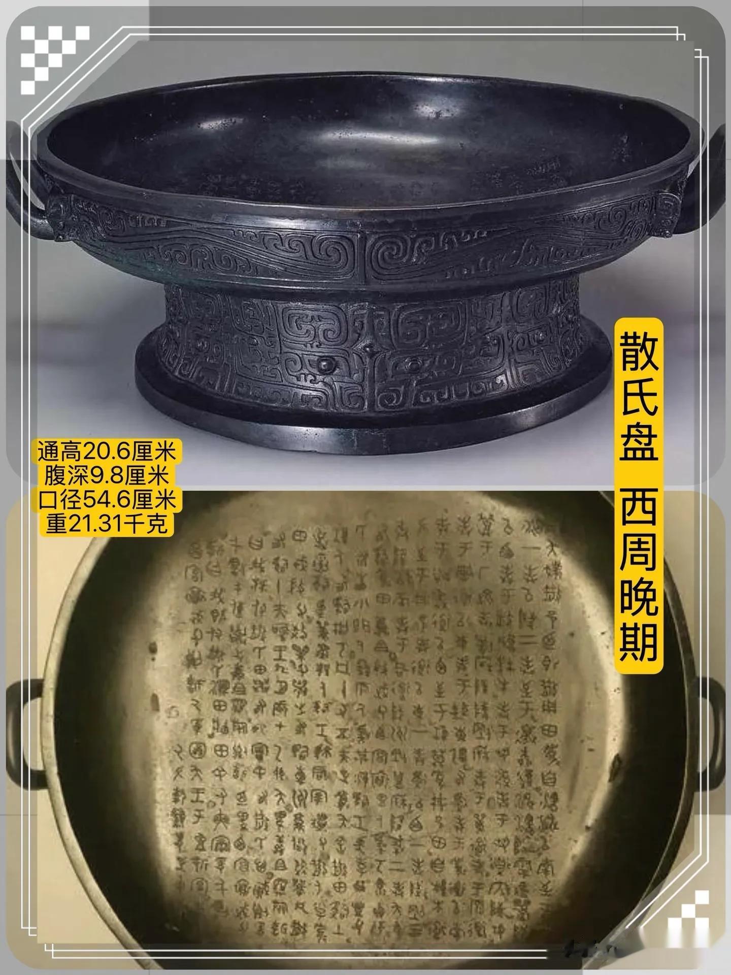 散氏盘:又称夨人盘,西周晚期青铜器,因铭文中有“散氏”字样而得名,是“晚清四大国宝”之一。清乾隆年间陕西凤翔出土。内底铸有铭357字,内容为一篇土地割让的契约,是金文中少见的特例,也是研究西周土地管理制度的重要史料,其铭文书法浑朴雄伟,壮美多姿。