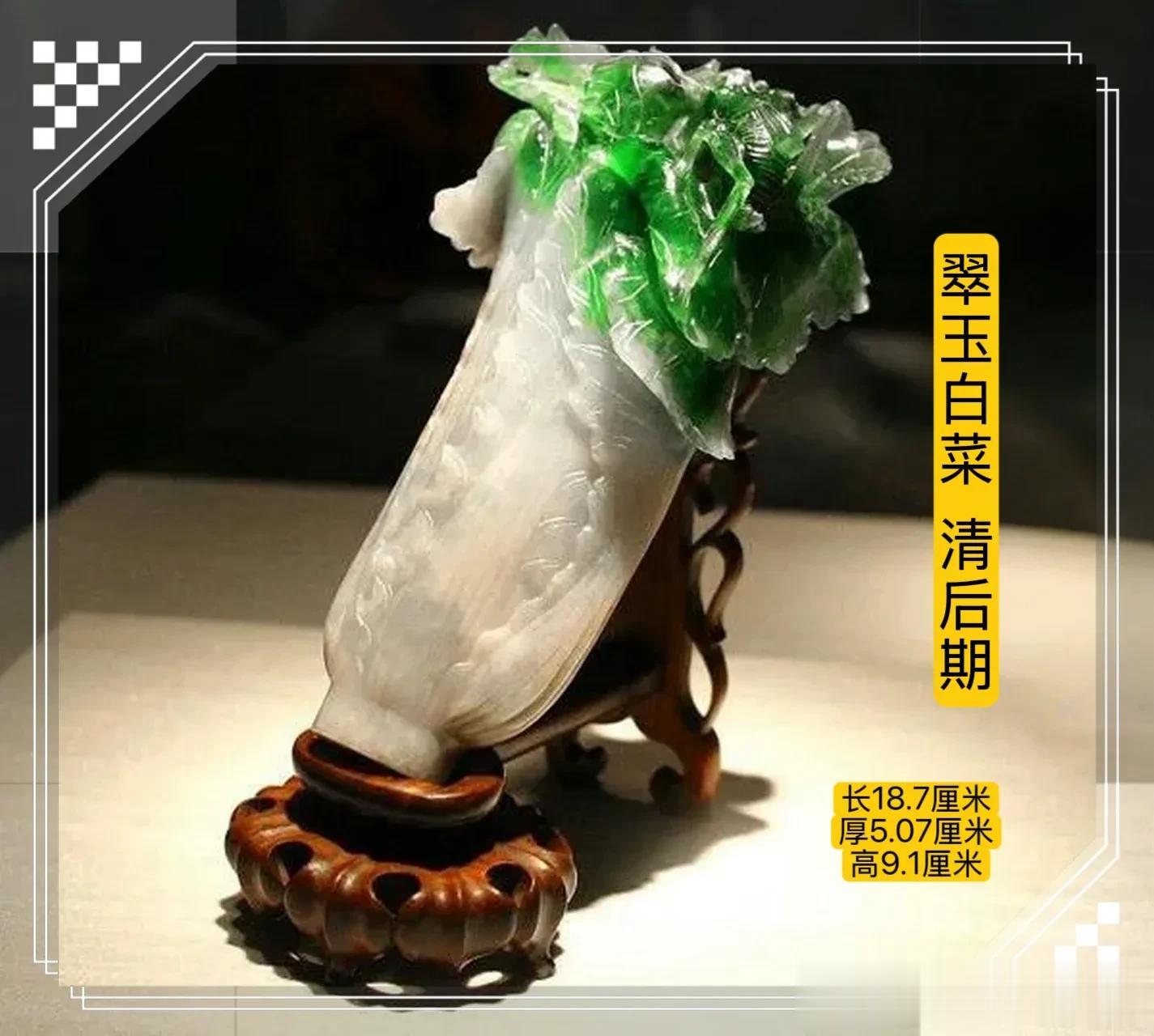 翠玉白菜:由翠玉雕琢而成,菜身洁白,叶子翠绿,菜叶上还停留着寓意多子多孙的螽斯和蝗虫。原是紫禁城永和宫的陈设器,据说为清末瑾妃的嫁妆,其原料来自缅甸,工匠“量材就质”,将绿色部位雕成菜叶,灰白部位雕成菜帮,其为清代玉雕技术的巅峰之作。