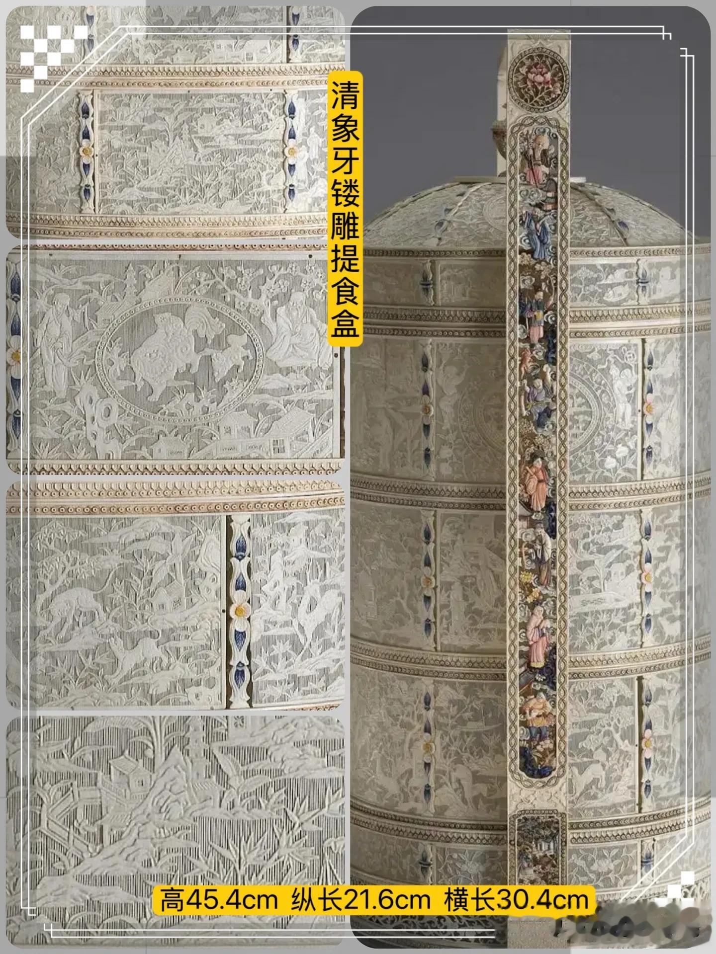 清象牙镂雕提食盒:是清宫旧藏珍品,盒身为四层屉格设计,以镂空象牙片嵌成,雕有人物、鸟兽等纹饰,盖钮、提手等有色彩点缀,提把刻八仙。其雕工精细,象牙片轻薄,透雕细腻,尽显清代象牙雕刻的高超工艺水准。