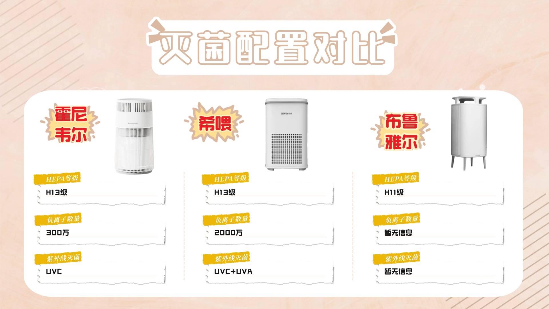 测试方法:查询各品牌空气净化器的灭菌技术,分析其具体配置及性能参数,并汇总成对比表格进行分析。