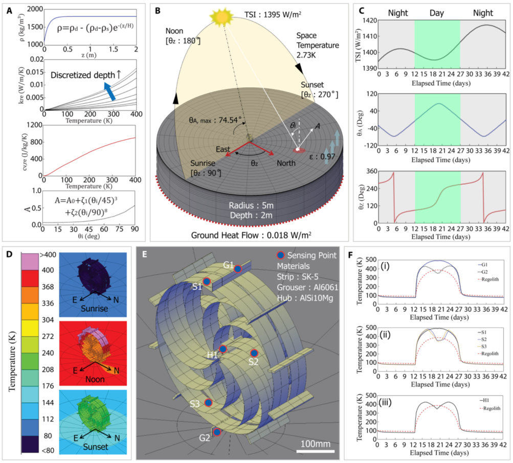 图 5 车轮热分析条件和结果。(A)任务区月壤的热物理和热光学特性。(B)月壤热模型、分析条件和太阳辐射。(C)42天任务期间的太阳总辐射、太阳仰角和太阳方位角。(D)热分析结果显示了车轮在太阴日不同时间的温度等高线:日出、正午和日落。(E)从(B)扩展的车轮热模型,显示材料成分和温度感应点;在松鸡上,暴露在阳光下和自我遮蔽的位置被标记为G1和G2,在条带上被标记为S1到S3。标尺,100 mm. (F)在(E)中每个感应点的温度变化;(I)抓地齿,(ii)板条,和(iii)轮毂。