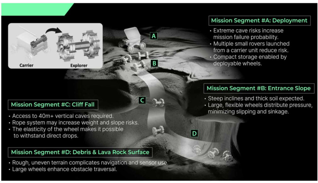 🔸多车协同部署:利用车轮的高收纳比,在单次发射中堆叠多辆探测车,协同进入熔岩管