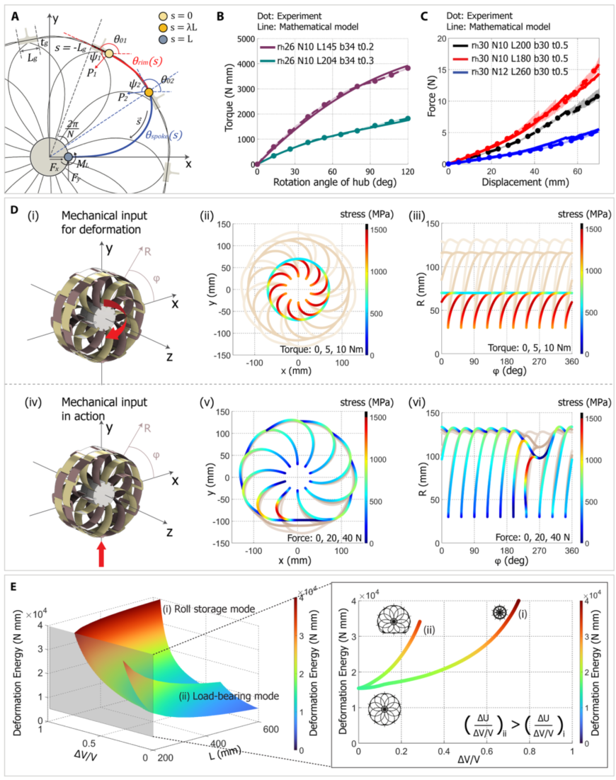 图3A 是车轮结构分析的自由体图,将单根钢带视为大挠度悬臂梁,约束点包括前后相邻钢带的接触点以及轮毂固定点。通过求解弯曲应变能,可以预测收纳扭矩和垂直刚度。图3B 和 3C 分别验证了收纳扭矩和垂直载荷的理论模型,实验与理论高度吻合。