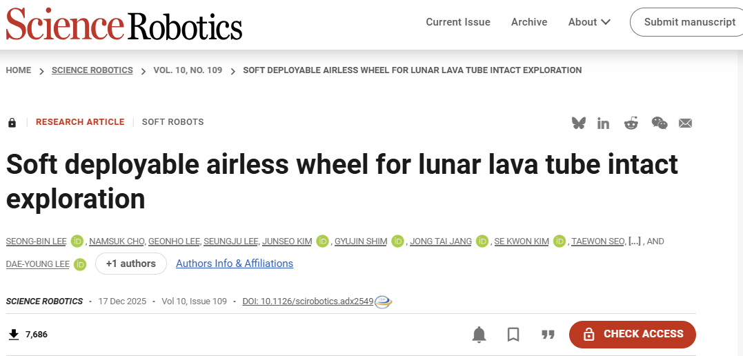 引文格式:Lee S B, Cho N, Lee G, et al. Soft deployable airless wheel for lunar lava tube intact exploration[J]. Science Robotics, 2025, 10(109): eadx2549.