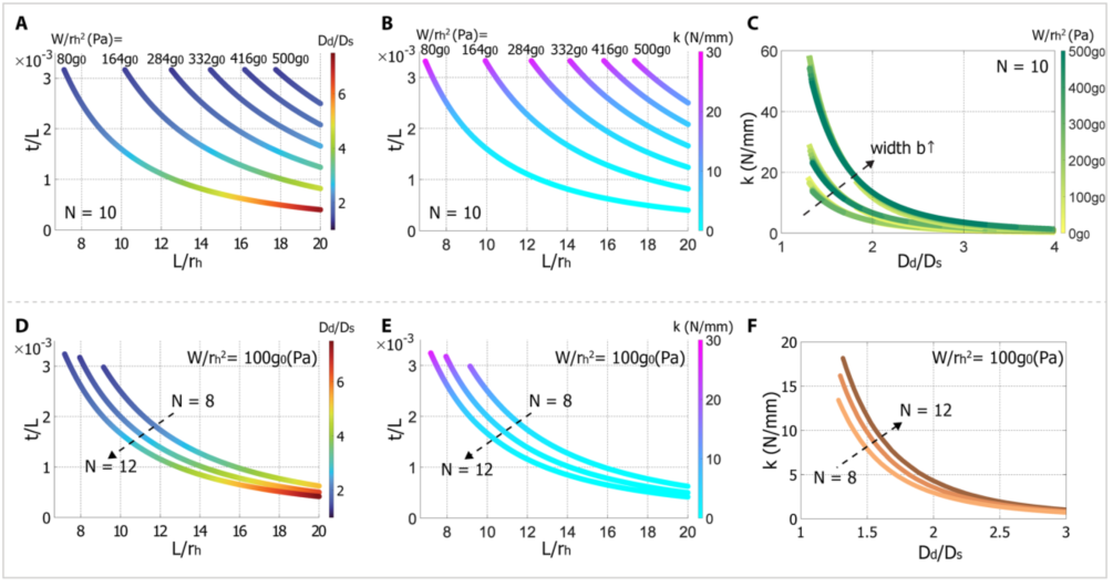 图 4 设计参数L/rh和t/L的分析结果。(A)如何选择设计参数以实现所需的W和车轮性能Dd/Ds和(B)结构弹性(b = 50 mm)。(C)Dd/Ds和结构弹性的权衡:宽度b扩展性能极限(b = 30、50和100 mm)。增加条带数N提高了性能(D) Dd/Ds和(E)结构弹性(b = 50 mm)。(f)随着𝑁的增加,性能极限扩大,但存在车轮总重增加的风险,这在图表中没有反映出来(b = 50毫米)。
