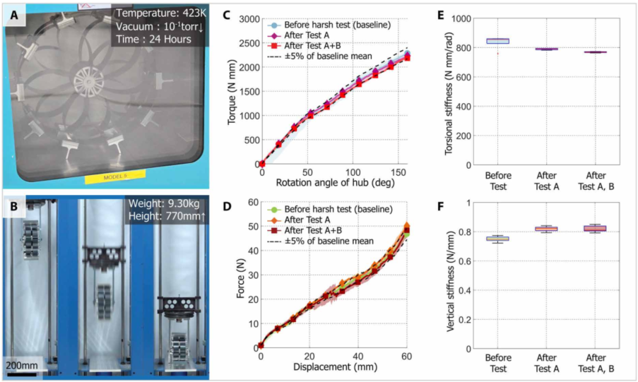 图6A 展示了热真空测试(423K, 10⁻¹ torr, 24小时)。图6B 展示了垂直跌落冲击测试(9.30kg重物从770mm高处跌落,等效月面100米坠落)。图6C-6D 显示单一样本在测试后收纳扭矩和承载能力变化在±5%以内。图6E-6F 展示了五个样本的统计结果(箱线图),验证了车轮在极端环境下的鲁棒性。