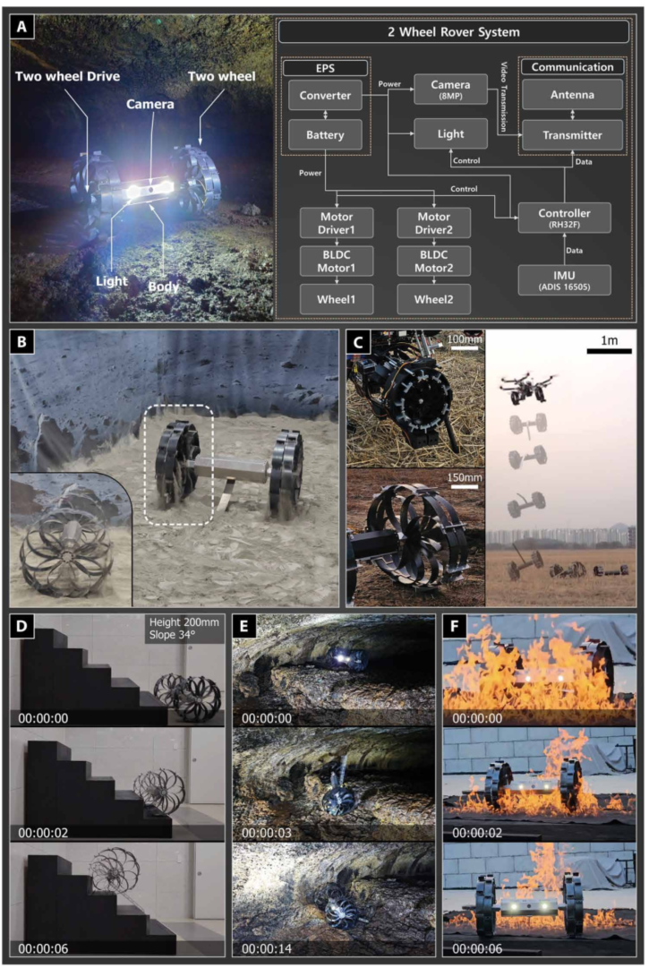图 8 漫游者系统配置和现场测试。为了在极端条件下进行性能评估,对配备有软可展开轮的两轮虚拟漫游车进行了现场测试。(A)系统配置,包括电源、通信、控制和驱动模块,旨在支持月球洞穴环境中的导航和机动性。(B)在模拟月球土壤上行走证明了在多尘条件下的稳定性和对沙坑的抵抗力。(C)撞击弹性测试验证了月球车在地球重力作用下坠落4米后的结构完整性(装载状态比例尺,100毫米;展开状态比例尺,150毫米;跌落测试比例尺,1米)。(D)爬坡能力评估表明,月球车成功地克服了一个200毫米的台阶状障碍,坡度为34°。(E)在模拟月球洞穴条件的陆地洞穴内的不规则岩石地形上进行性能验证。(F)耐高温测试证实了车轮在极端高温环境下的耐用性。