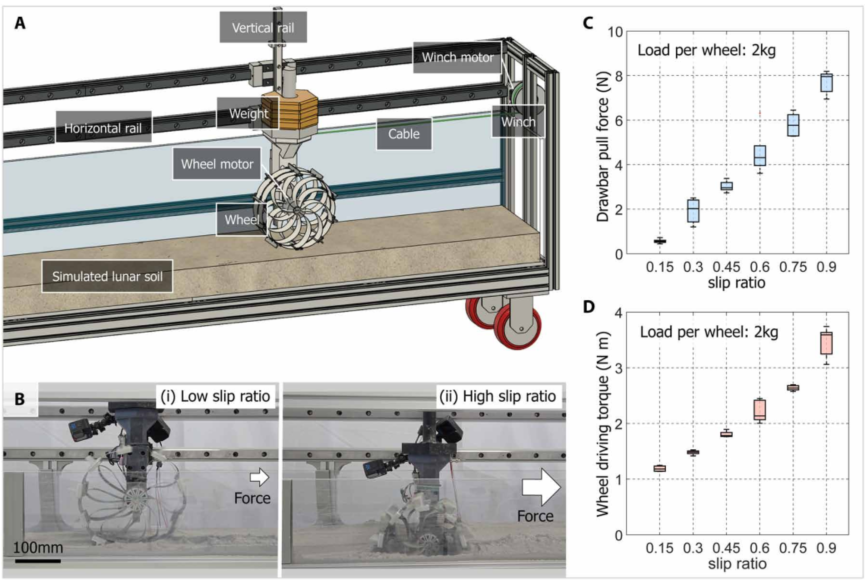 图7A-7B 展示了在模拟月壤KOHLS-1上的牵引力测试平台和不同滑移率下的车轮沉陷情况。图7C 给出了不同滑移率下的牵引力,图7D 给出了驱动扭矩。结果表明,车轮在滑移率≤0.5时可提供足够牵引力,支持4kg两轮车爬上约10°斜坡。