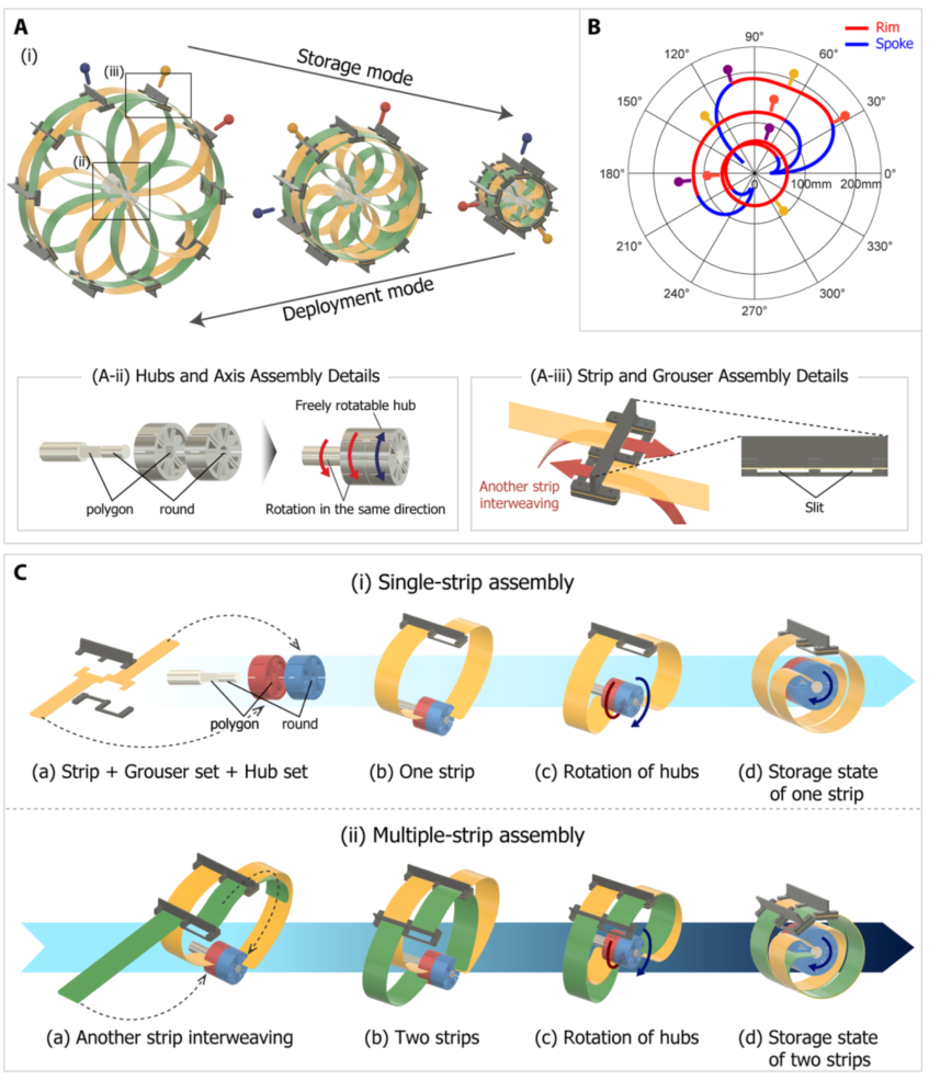 该车轮由弹性钢带编织成螺旋互锁结构,利用材料本身的连续变形实现形状变换,完全摒弃了传统折纸或铰链结构中的易损关节。图2A 展示了车轮结构:左右轮毂可反向旋转,钢带穿过履刺块(grouser)的狭缝相互交织,形成可收放的轮辐和轮辋。图2B 展示了单根钢带从展开到收纳的形状变化,图2C 展示了多根钢带的组装和收纳过程。