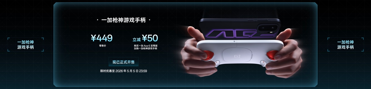 一加枪神游戏手柄,零售价449元,购买一加 Ace 6至尊版,加购一加枪神游戏手柄可享50元优惠。