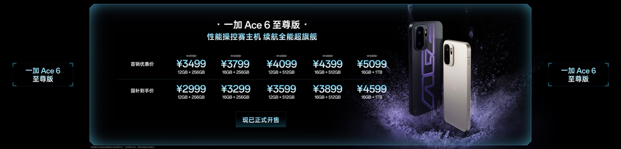 一加 Ace 6 至尊版现已全渠道正式开售,用户前往 OPPO 商城、京东、天猫、拼多多、抖音等平台,可享受以旧换新购机补贴等丰富福利。新品具体售价如下: