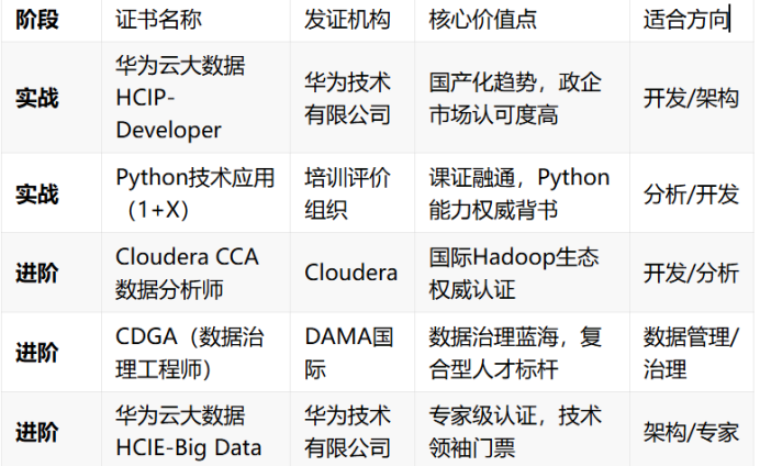 华为云大数据工作级开发者认证(HCIP-Big Data Developer):国产化趋势下的优选。华为云在政企市场地位稳固,此认证含金量高,备受相关企业青睐。