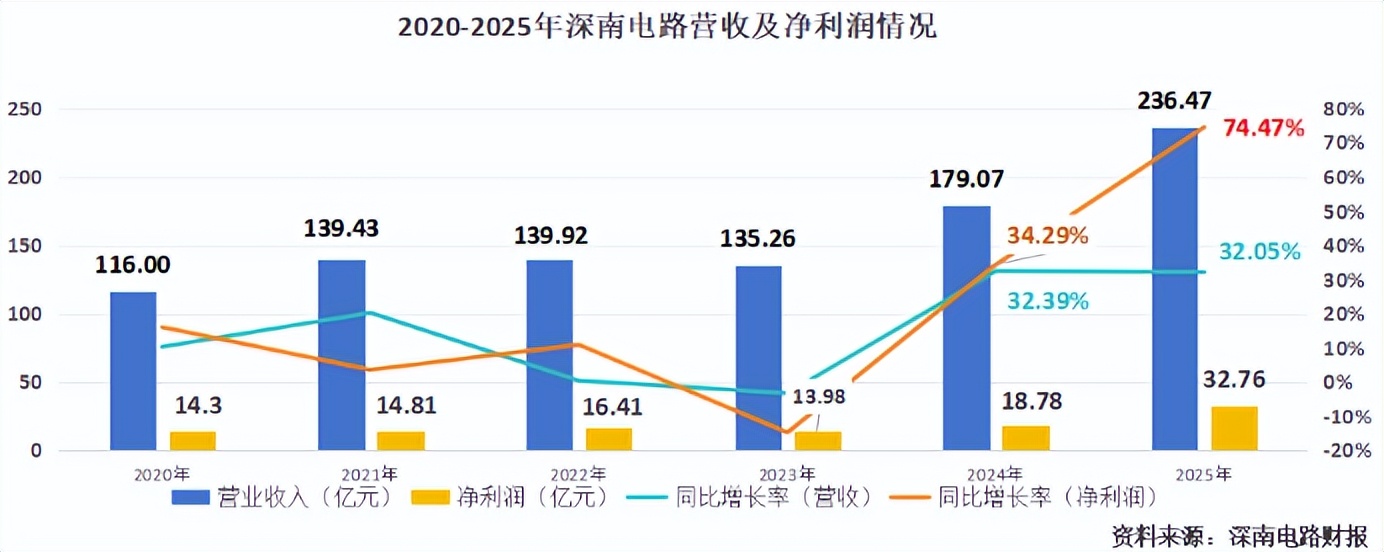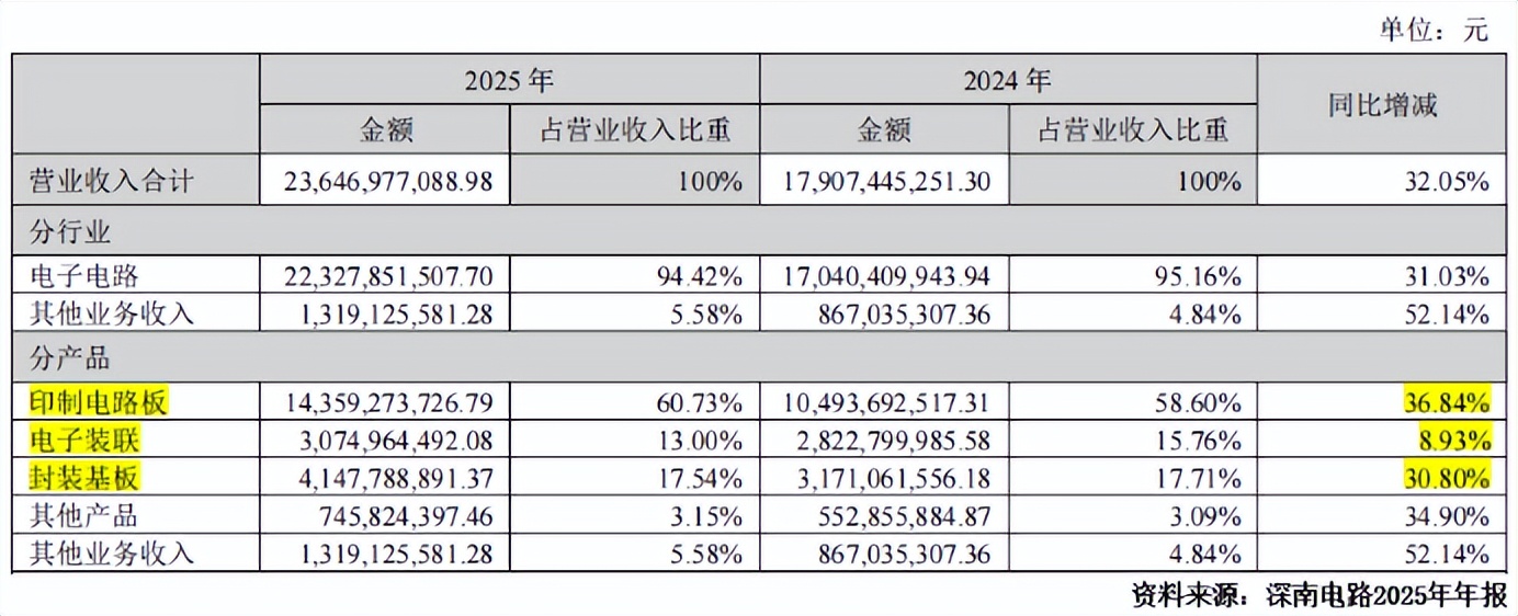 目前,封装基板已成为公司重要业绩动能。2025年,其封装基板营收41.48 亿元,同比增长30.8%,约占营业总收入的18%。