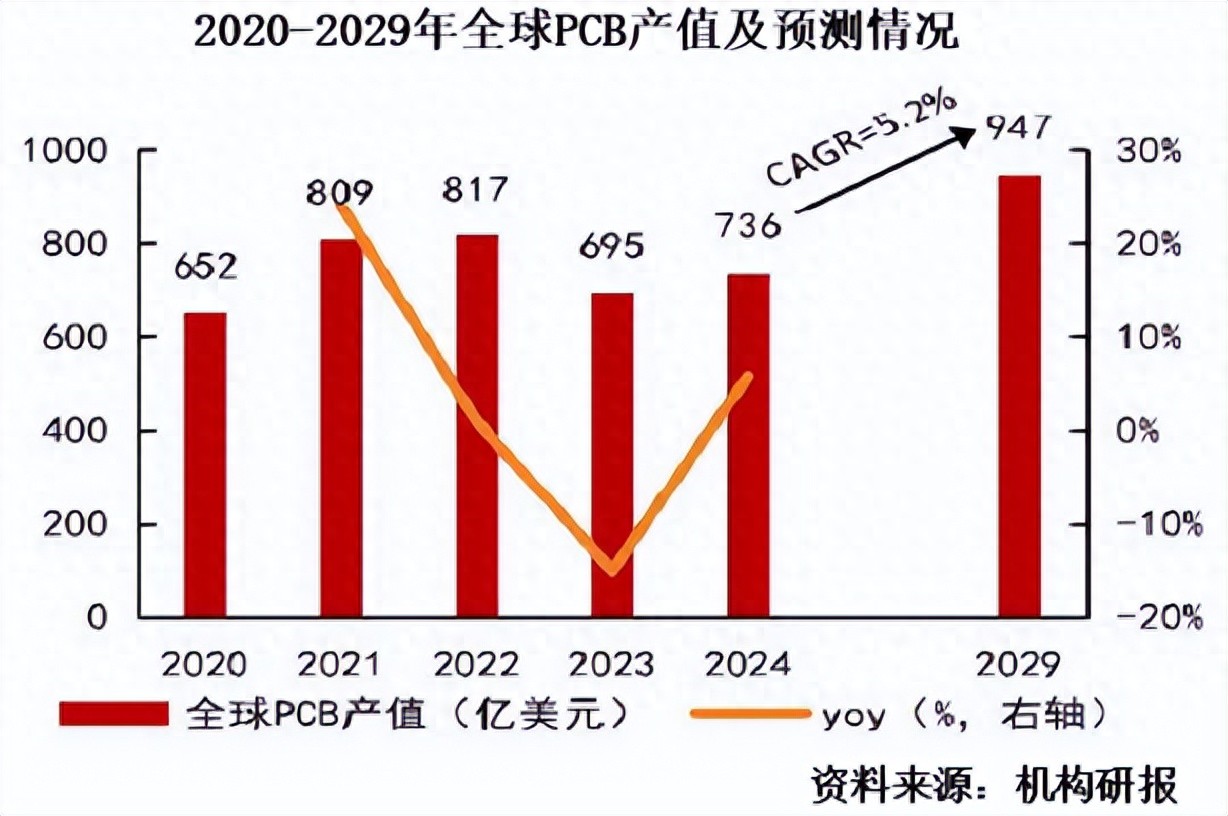 受此驱动,2020-2029年,全球PCB产值预计将从652亿美元提升至947亿美元。