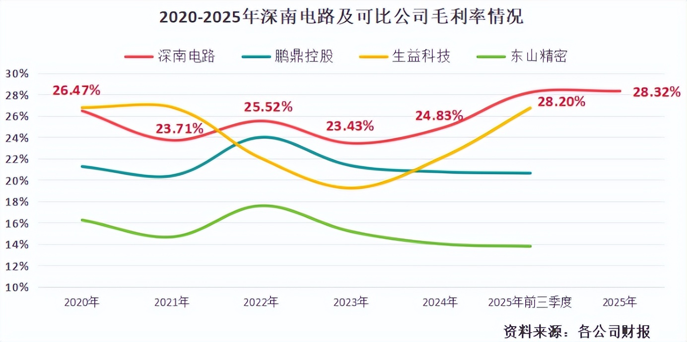 2025年前三季度,公司毛利率高达28.2%,高于鹏鼎控股、生益科技、东山精密等PCB巨头。公司2025年全年的毛利率为28.32%,继续维持在较高水平。