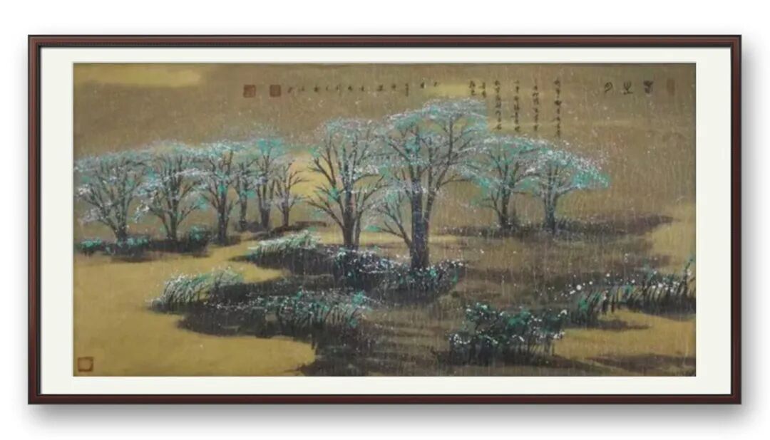 观其山水,常见林木参差、溪泉隐现,看似寻常的景致,却在笔墨的铺陈中生出诗意。山石的皴擦兼用披麻与斧劈之意,既有南方山水的温润,又含北方丘壑的雄健;林木的点染虚实相生,近者苍劲挺拔,远者朦胧含烟,形成层次丰富的空间纵深。更难得的是,他笔下的山水并非孤立的自然景观,而是人与天地相融的精神载体——溪畔隐现的茅舍、山间蜿蜒的小径,皆为精神栖居的注脚,让静默的山水有了人间温度,恰如“秦岭深处有人家”那般,于幽远中藏温情,于苍茫中见生机。