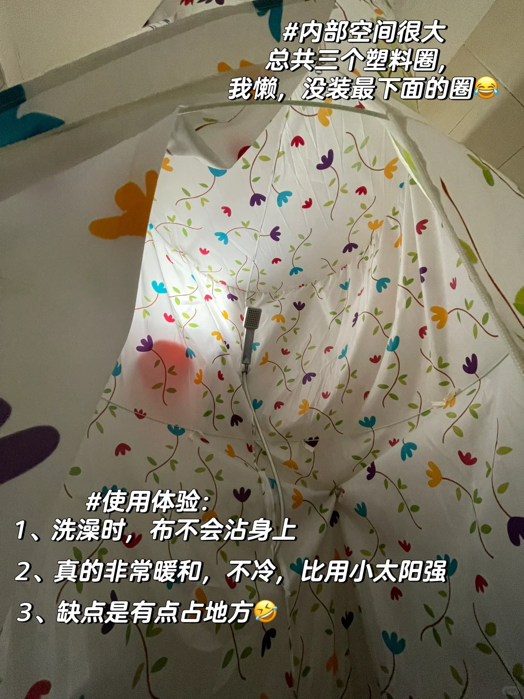 然后将花洒从上面的小口放进来,打开热水,过了一会儿之后浴罩里面就能暖呼呼的了。