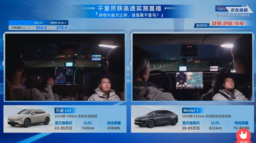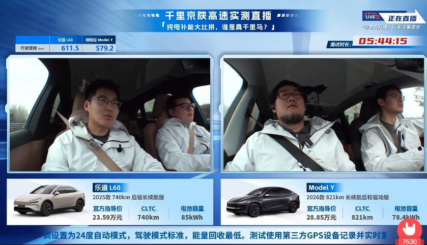近日,就有汽车媒体做了一个长途补能测试直播,此次测试的车辆就是乐道L60、特斯拉Model Y这两款车。此次测试从北京出发,走京港澳高速达到郑州,再从郑州出发走连霍高速直达陕西西安,全程1077公里。此次测试车辆满载,空调调至24度,标准驾驶模式,能量回收调至低,基本复现了春运长途旅行。