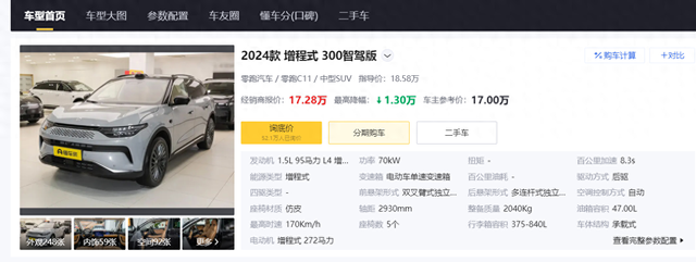 如果预算在20万以内,想要购买一台颜值、空间、配置、动力以及续航都不错的中型新能源SUV,不妨看看2024款零跑C11,该车售价区间为14.88万-20.58万元,定位中型SUV,提供了增程式和纯电两种版本。尤其是增程式版本解决了里程焦虑问题,适合日常通勤和长途出行。今天为大家带来零跑C11 2024款 增程式 300智驾版,指导价18.58万,成都地区经销商报价优惠1.3万,下面我们一起来看看这款车究竟有着怎样的表现?