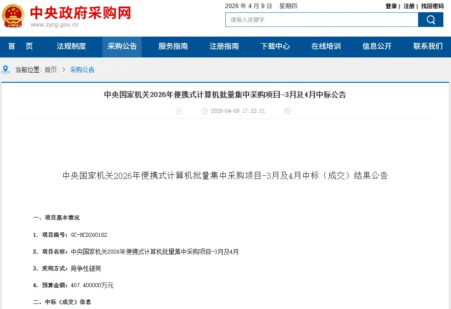 2026年4月9日,中央国家机关政府采购中心发布"2026年便携式计算机批量集中采购项目-3月及4月"中标(成交)结果公告(项目编号:GC-HCD260182)。本次采购总预算达到407.4万元,最终三个配置包完成中标,一个包因无供应商响应而废标。