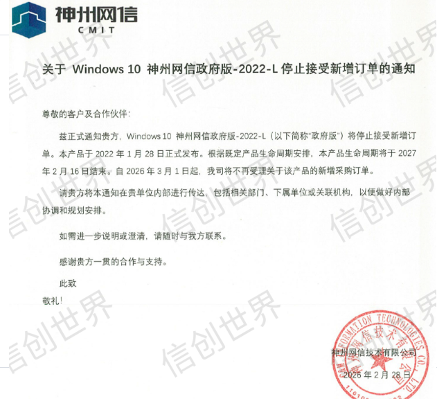 早在今年3月份初,就有媒体爆料,Windows10神州网信政府版-2022-L(以下简称“政府版")已经停止接受新增订单。