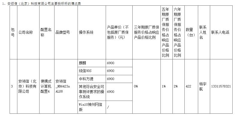 从本次中标公告的技术细节显示,Win10神州网信版已实质退出央采主流配置。在中国长城、联想开天、安领信三家的投标标的情况表中,"Win10神州网信版"一栏均明确标注为"/"(即不提供),而麒麟、统信UOS、中科方德及其他符合安全可靠测评要求的操作系统均正常报价。
