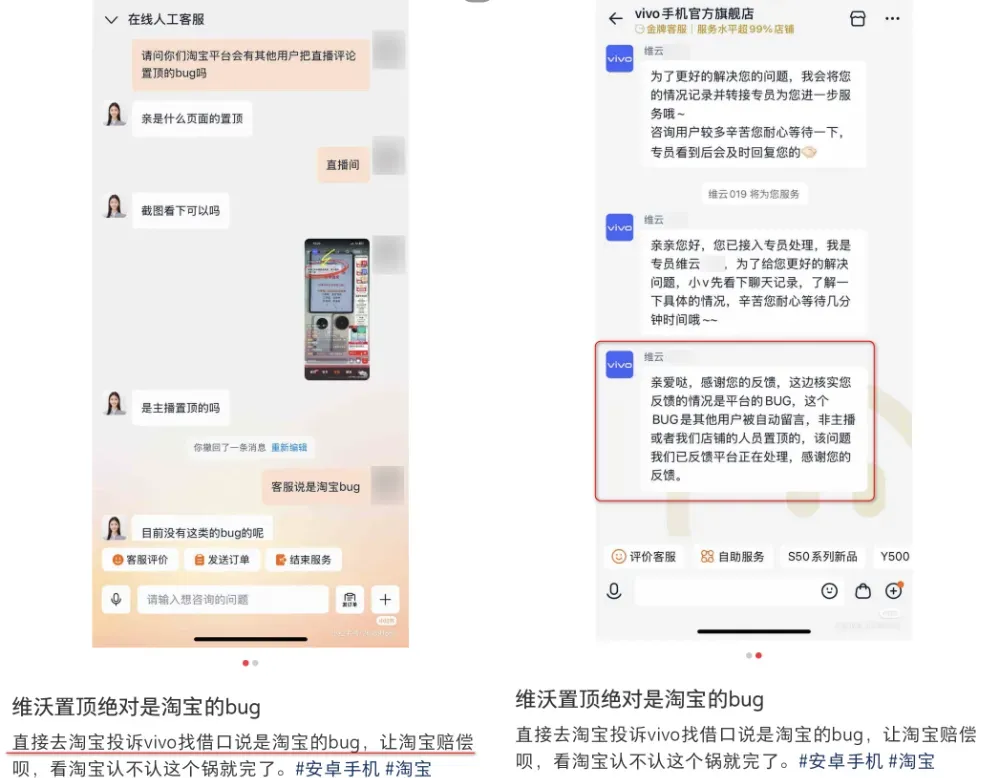 问题一:vivo出事后,第一时间疑似先甩锅给某宝直播置顶出现bug。