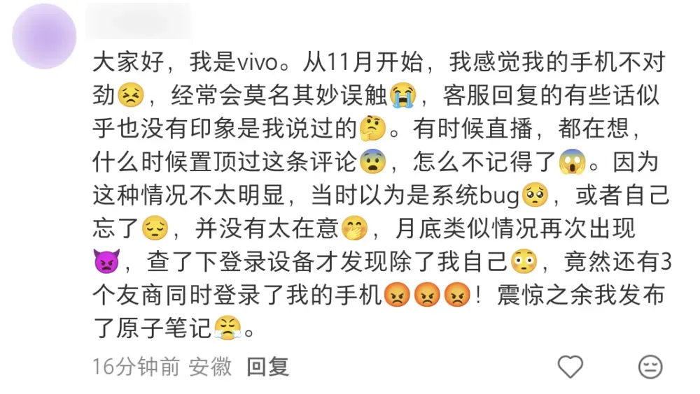 由于当晚vivo直播间异常涌入了大量和产品无关的评论,导致个别诋毁性评论被主播在慌乱中不慎误触被意外置顶。