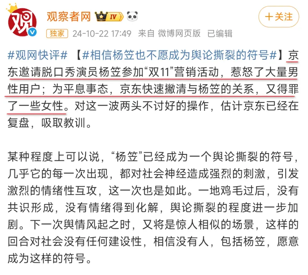 但事情发展到如今这个局面,还是让人有那么些许感到魔幻。不禁让人想起了,此前京东请杨笠代言,也是被部分男性消费者,冲到连夜撤代言。