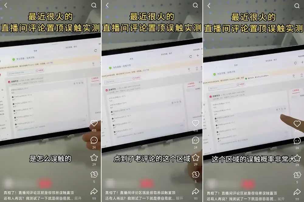 还真有博主@玩机少女cici登陆某宝直播后台做了个小测试。由于置顶标就在旁边,确实存在滑动中误触的这种可能。