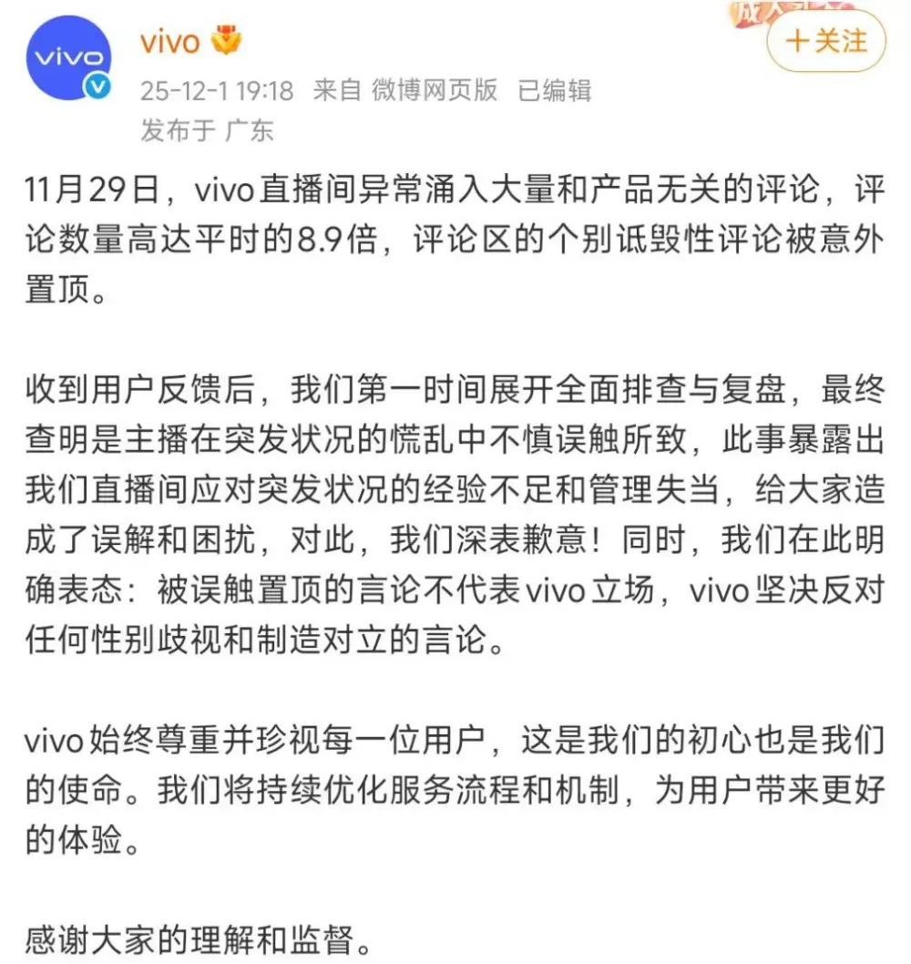vivo将本次直播事故归结为“意外”。然而,毫无意外的是,部分网友并不买账。