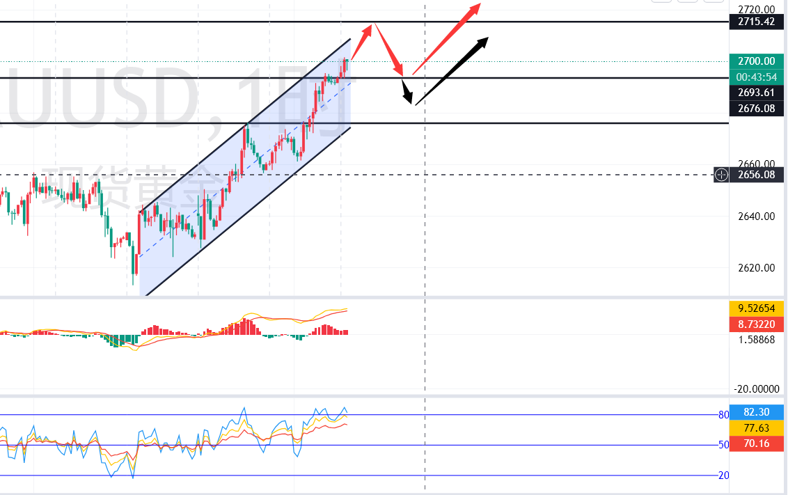 从一小时级别的黄金价格走势分析,整体而言,黄金展现出明确的上行趋势。在触及2675的高点后,价格经历了一次回调至2656,随后迅速反弹,并再次冲高至2673,之后再次回调至2661,这一系列的波动构成了一个双底的技术形态。此后,金价成功突破前期高点,延续了原有的上涨趋势。观察MACD指标,原本快慢线有趋于形成死叉的迹象,但随后却转而拒绝形成死叉并继续上行,这表明市场多头力量依然强劲。同时,多头动能柱也经历了从缩量到放量的转变,进一步确认了多头的增强。在RSI指标方面,虽然一度进入超买区域并随后出现了调整动作,但调整完成后,金价仍显示出继续上涨的潜力。综上所述,黄金价格在未来一段时间内,有望继续维持其上涨趋势。