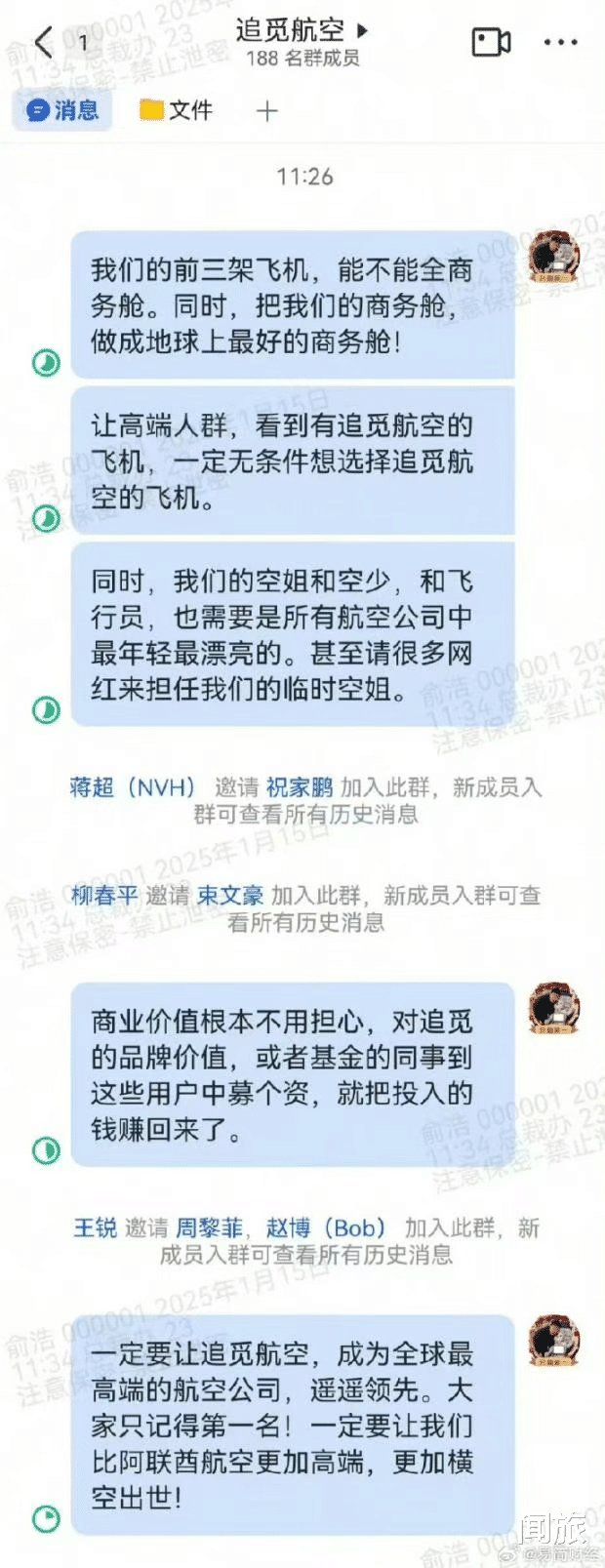天上飞的:成立了“追觅航空”群,说要搞比阿联酋航空还高端的航空公司。(目前还停留在群聊阶段)