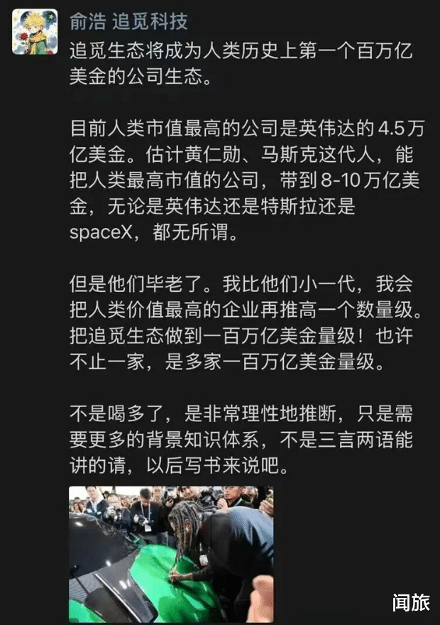 而就在俞浩在朋友圈“嘴搓”OTA产品之前,他刚刚发表了一个观点:虽然黄仁勋和马斯克或许能把公司带到8-10万亿美金的市值,但他比这些人小一代,他能把“追觅生态”做到100万亿美金量级。